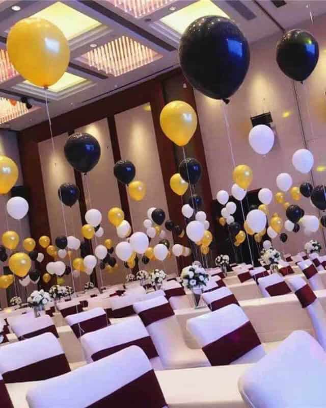 Зал лучше оформлять шариками, наполненными гелем – тогда они будут стремится вверх, а не порхать беспорядочно между гостями.